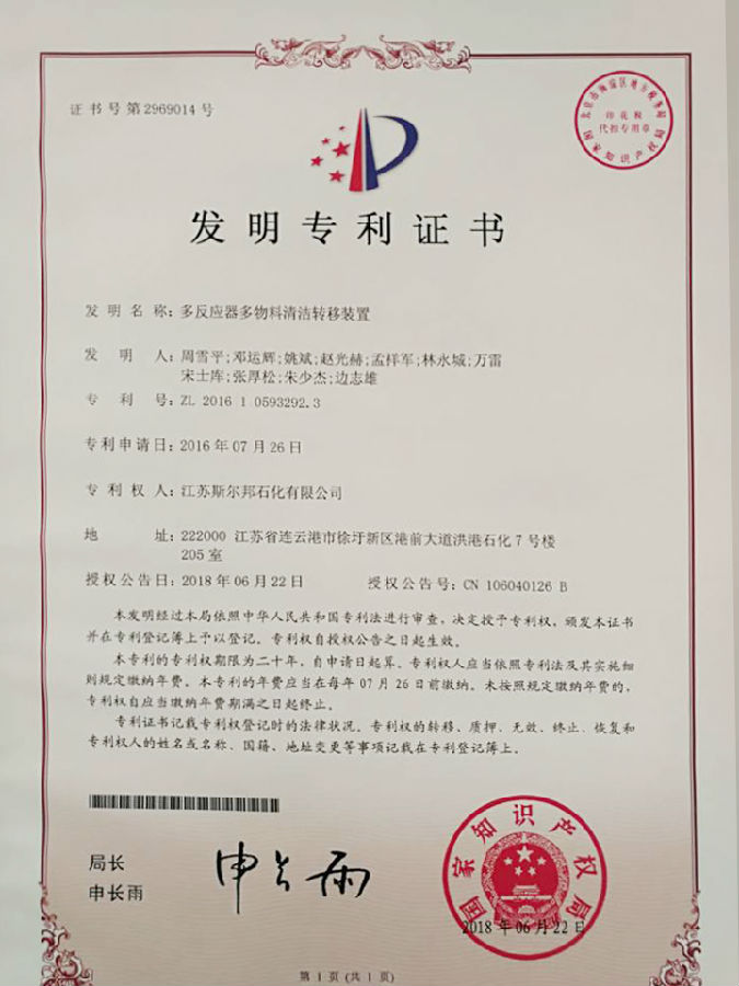 近日,斯爾邦石化收到國家知識產(chǎn)權局寄來(lái)的發(fā)明專(zhuān)利證書(shū),EO事業(yè)部2016年提報的發(fā)明專(zhuān)利“多反應器多物料清潔轉移裝置”喜獲認定通過(guò),這是斯爾邦石化獲得的第一項發(fā)明專(zhuān)利。