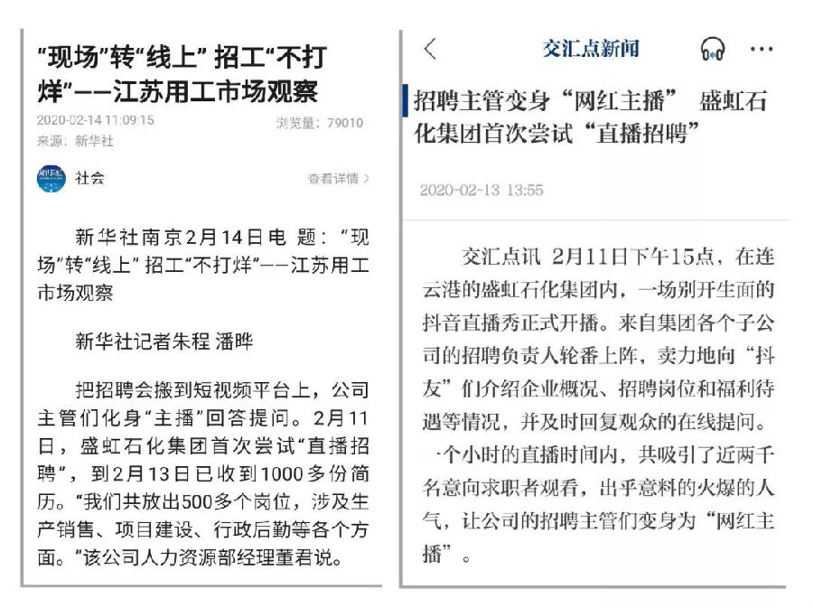這種創(chuàng )新嘗試也得到了中央、省級媒體的肯定。2月14日,新華社、新華日報交匯點(diǎn)新聞,都對盛虹石化“直播招聘”進(jìn)行了專(zhuān)題報道。